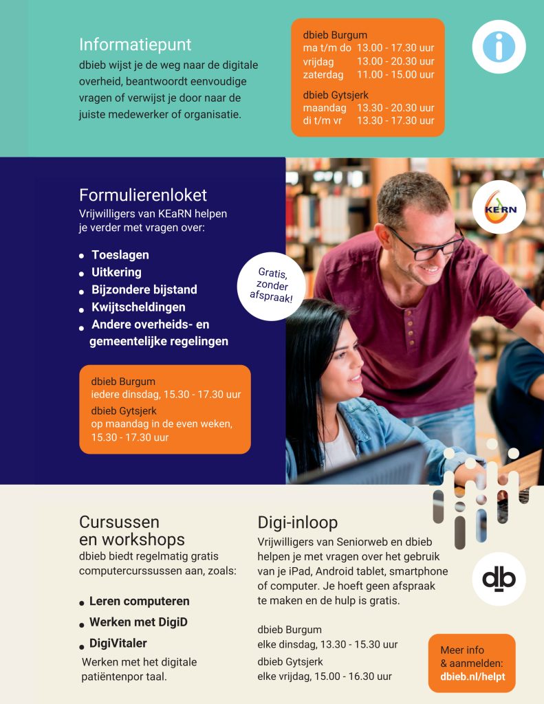 Kijk op dbieb.nl/helpt voor een compleet overzicht van alle spreekuren en cursussen.