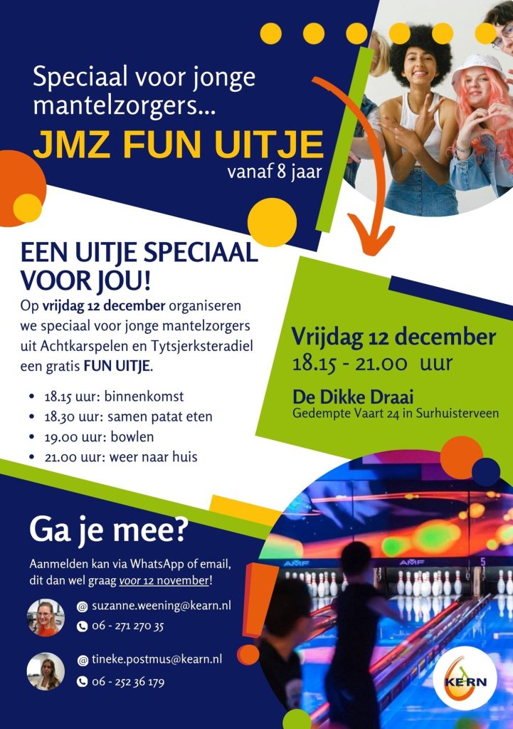 Speciaal voor jonge mantelzorgers uit de gemeente Achtkarspelen en de gemeente Tytsjerksteradiel organiseren we op vrijdag 12 december 2025 weer een Fun-Uitje! 🥳