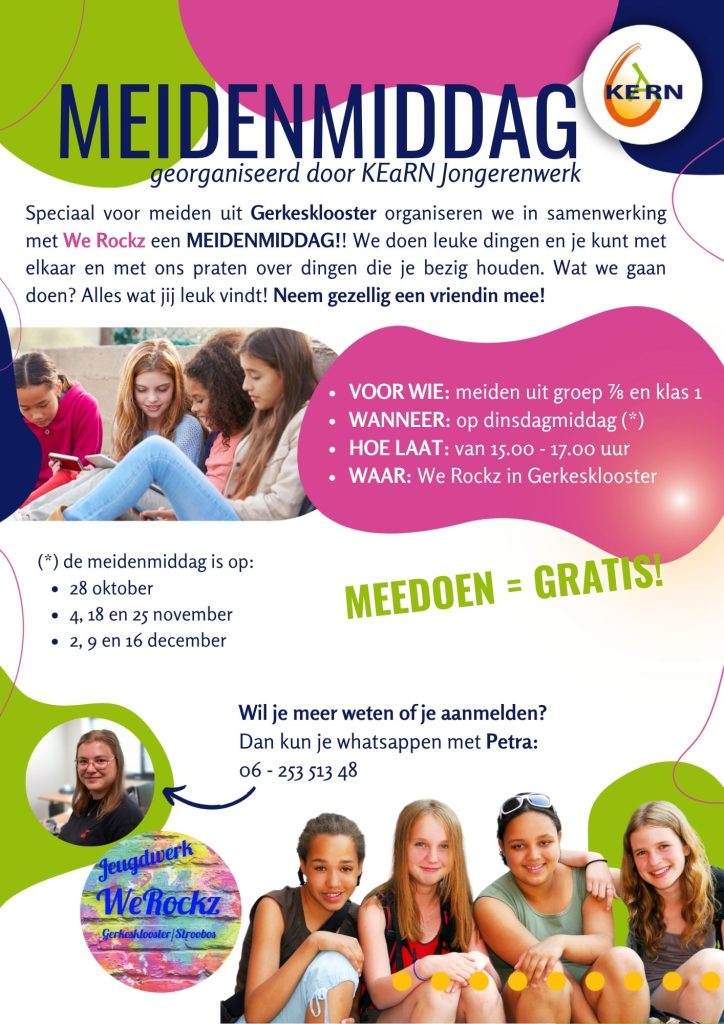 Speciaal voor meiden uit Gerkesklooster-Stroobos organiseren we in samenwerking met We Rockz een MEIDENMIDDAG!! We doen leuke dingen en je kunt met elkaar en met ons praten over dingen die je bezig houden. Wat we gaan doen? Alles wat jij leuk vindt! Neem gezellig een vriendin mee! 😍