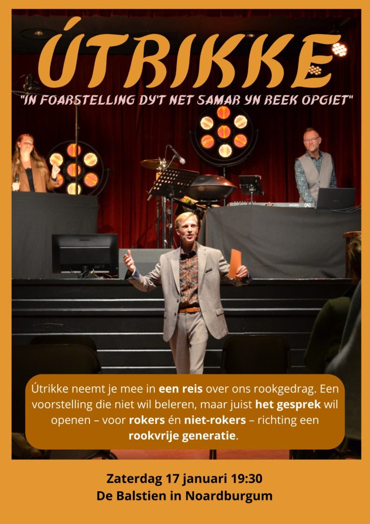 Na prachtige edities in Eastermar, Sumar en Burgum gaat Útrikke in het nieuwe jaar spelen in Noardburgum! Útrikke is een (gratis) voorstelling over roken door de tijd heen. Folkert Wesseling en zijn crew doen dit op een luchtige en leerzame manier. Het is interessant voor rokers en niet-rokers, want het gesprek over roken en vapen doen we samen.