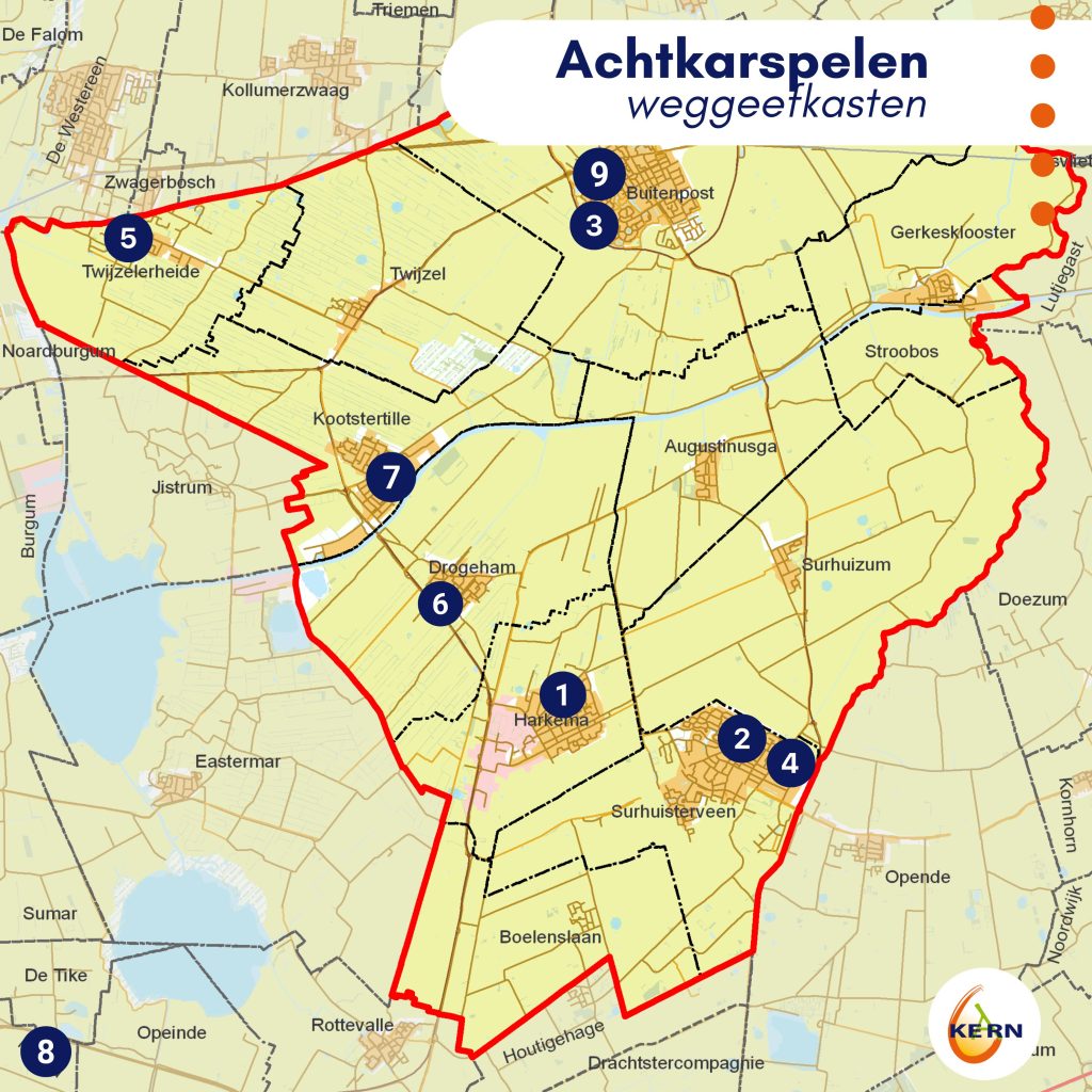 Hier vind je de overzichten van de weggeefkasten in Achtkarspelen en Tytsjerksteradiel. Wanneer je op het adres van de weggeefkast klikt, opent Google Maps.